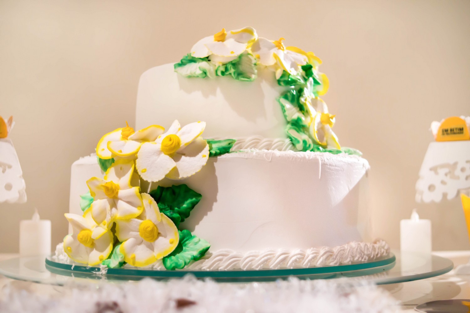 Bolo decorado com flores feitas com chantilly, dois andares, massa branca, recheio de doce de leite com coco.