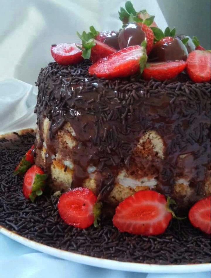 Bolo pelado, recheio de brigadeiro e beijinho com beijinho, coberto por uma calda de chocolate decorada com granulado e morango